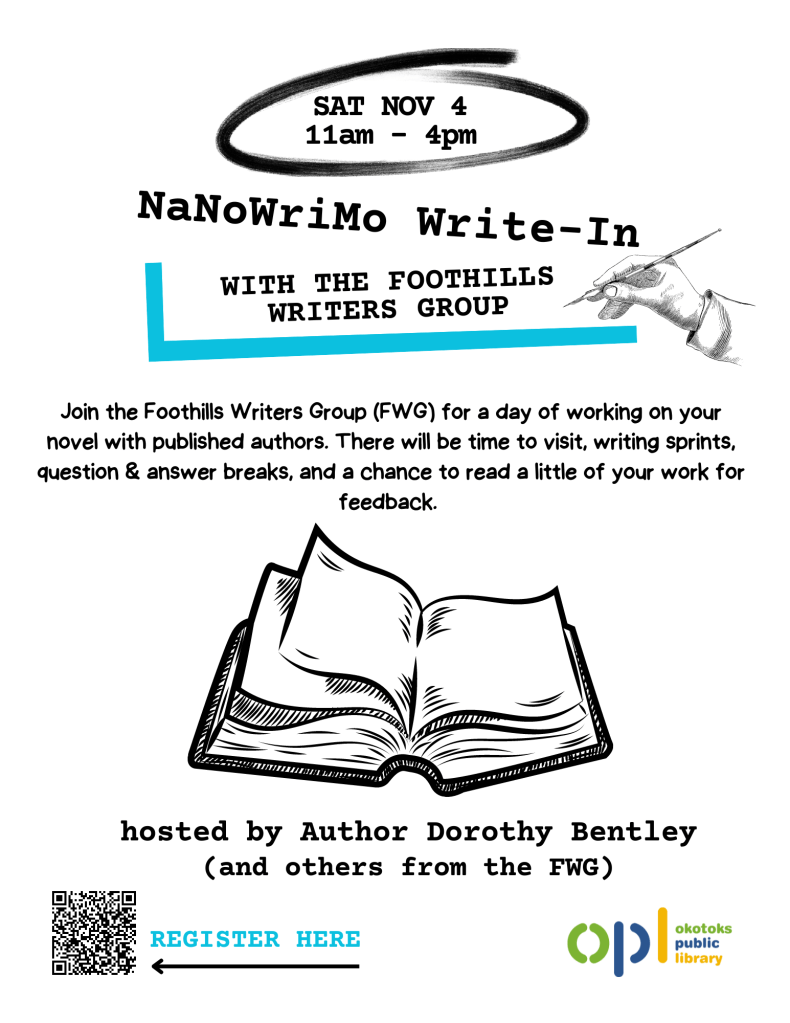 Thursday May 18, 6 PM. Foothills Writers Group monthly meeting. Educational session: Traditional Publishing, with Dorothy Bentley. Okotoks Public Library.