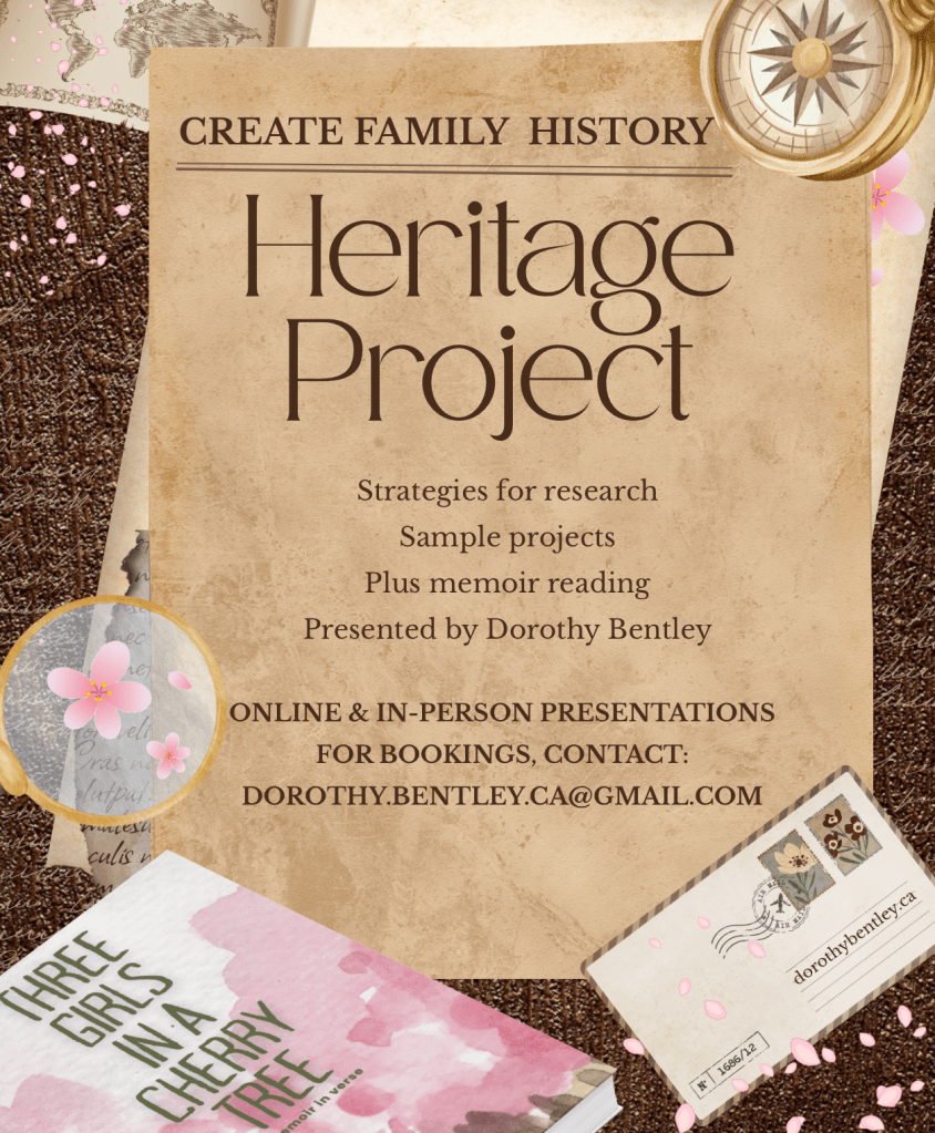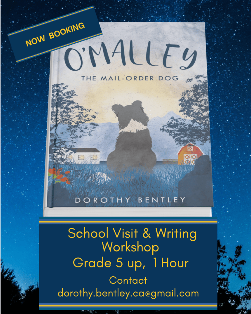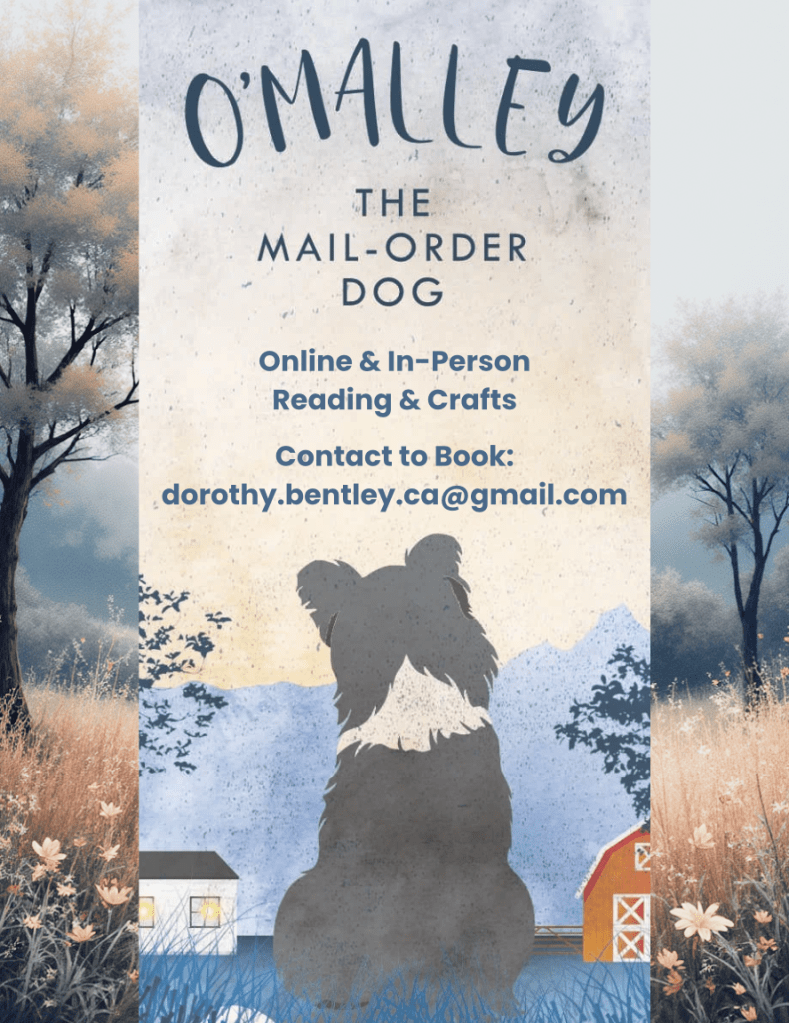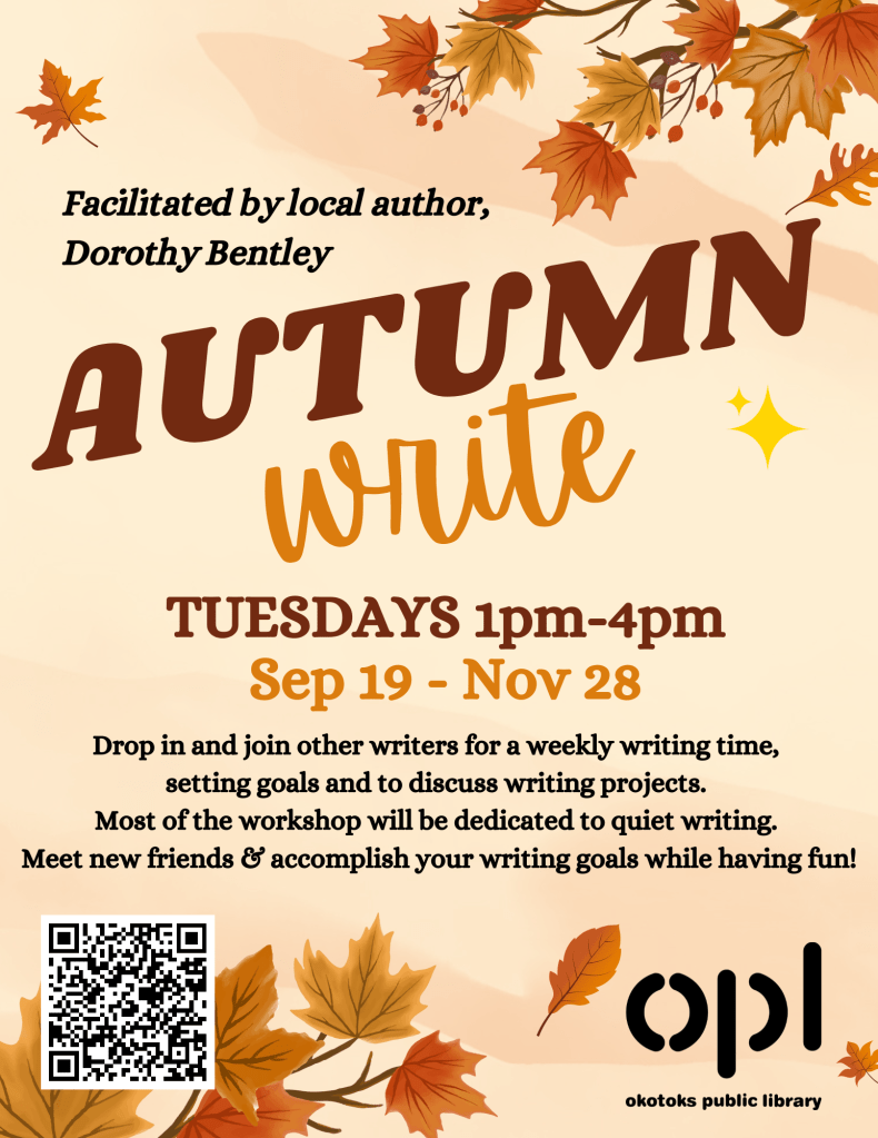 Dorothy will be at the Foothills Writers Group’s Local Author Book Fair, at the Okotoks Public. Saturday October 14, 11 am – 3 pm. She will have both her picture book, YA novel, plus free colour pages, stickers, and craft for children.