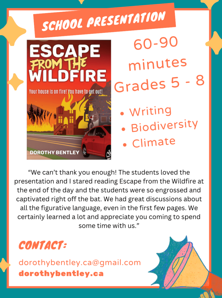 Note Received on the presentation: “I am the Learning Commons Facilitator at [a school]. I have just purchased Escape From The Wildfire from our local bookstore for our school library and would like some information about your availability and fees for a possible reading presentation/workshop with our Grade 5 and 6 students. I hear from the librarian at [a different school] that their students loved it!“